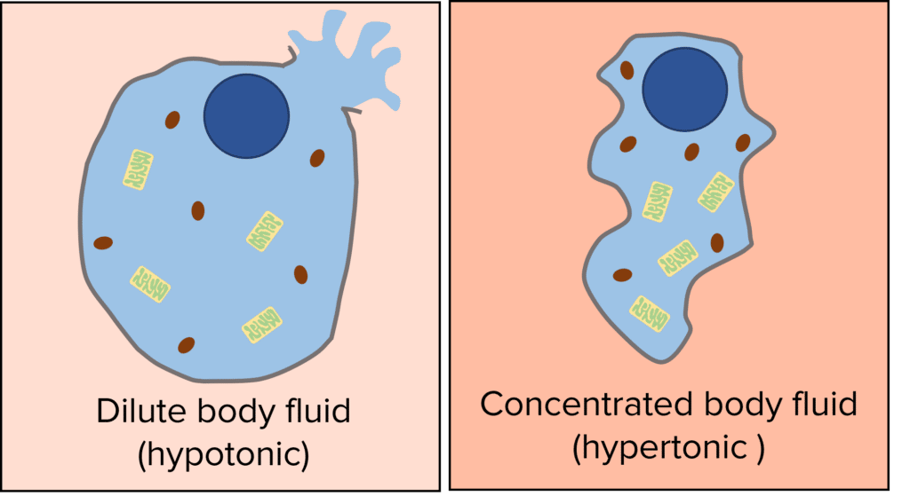 If body fluids surrounding the cells are more dilute (hypotonic) than inside the cell, water will move into the cells via osmosis. This can cause cells to burst. If body fluids surrounding the cells are more concentrated (hypertonic) than inside the cell, water will move out the cells via osmosis. This can cause cells to shrivel.