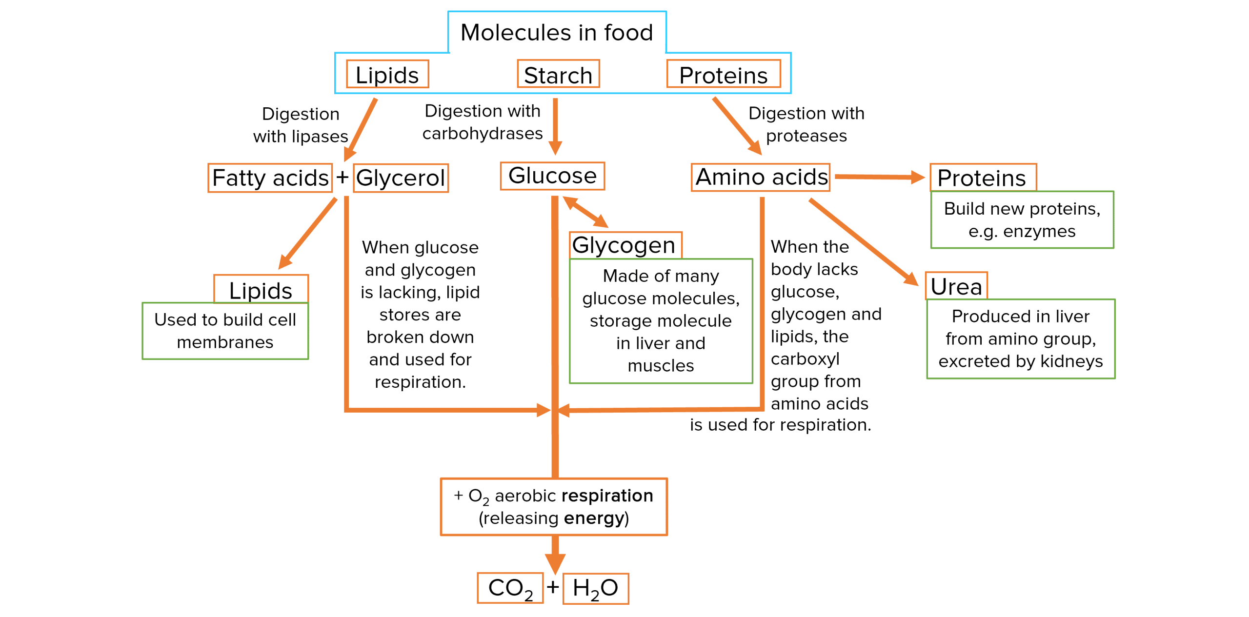 Glucose is either used for respiration (producing energy) or stored as glycogen in the liver and muscles until required.