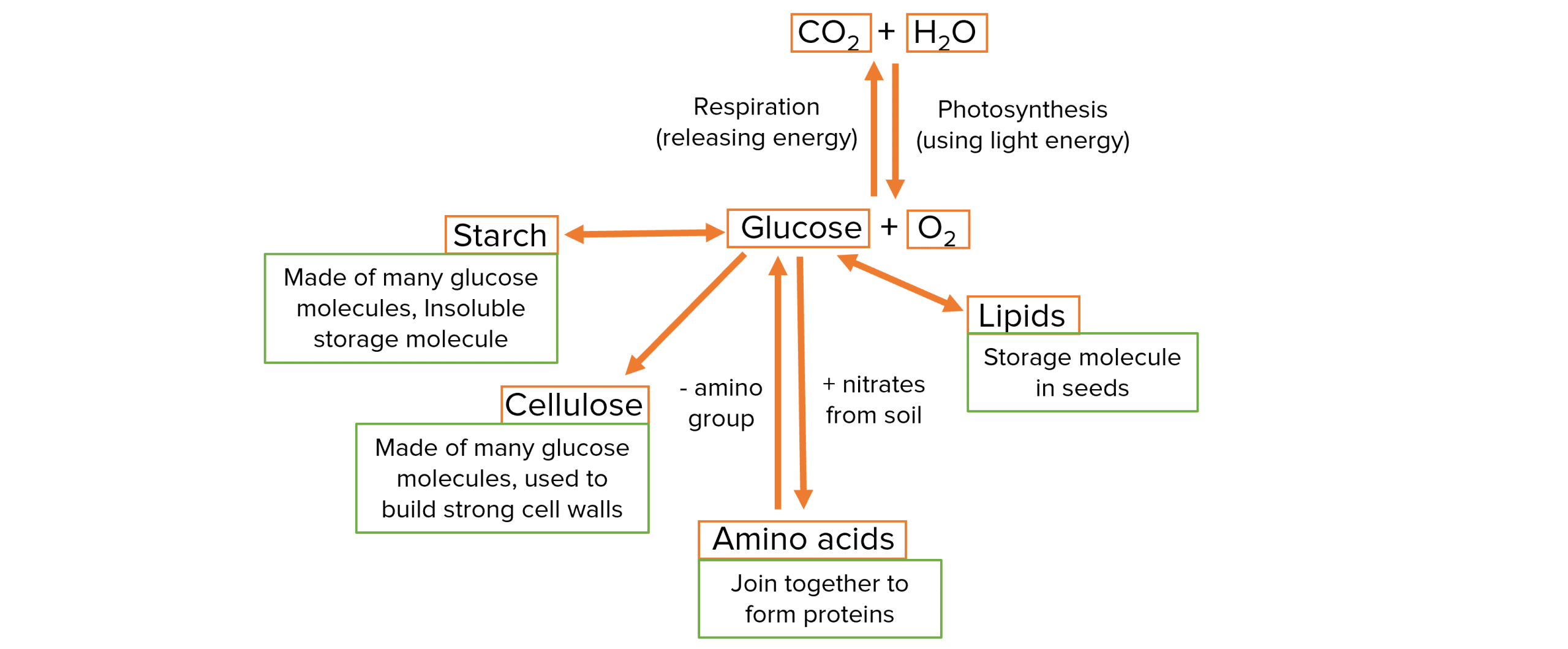 - Glucose can react with nitrates from the soil to form amino acids that make up proteins.