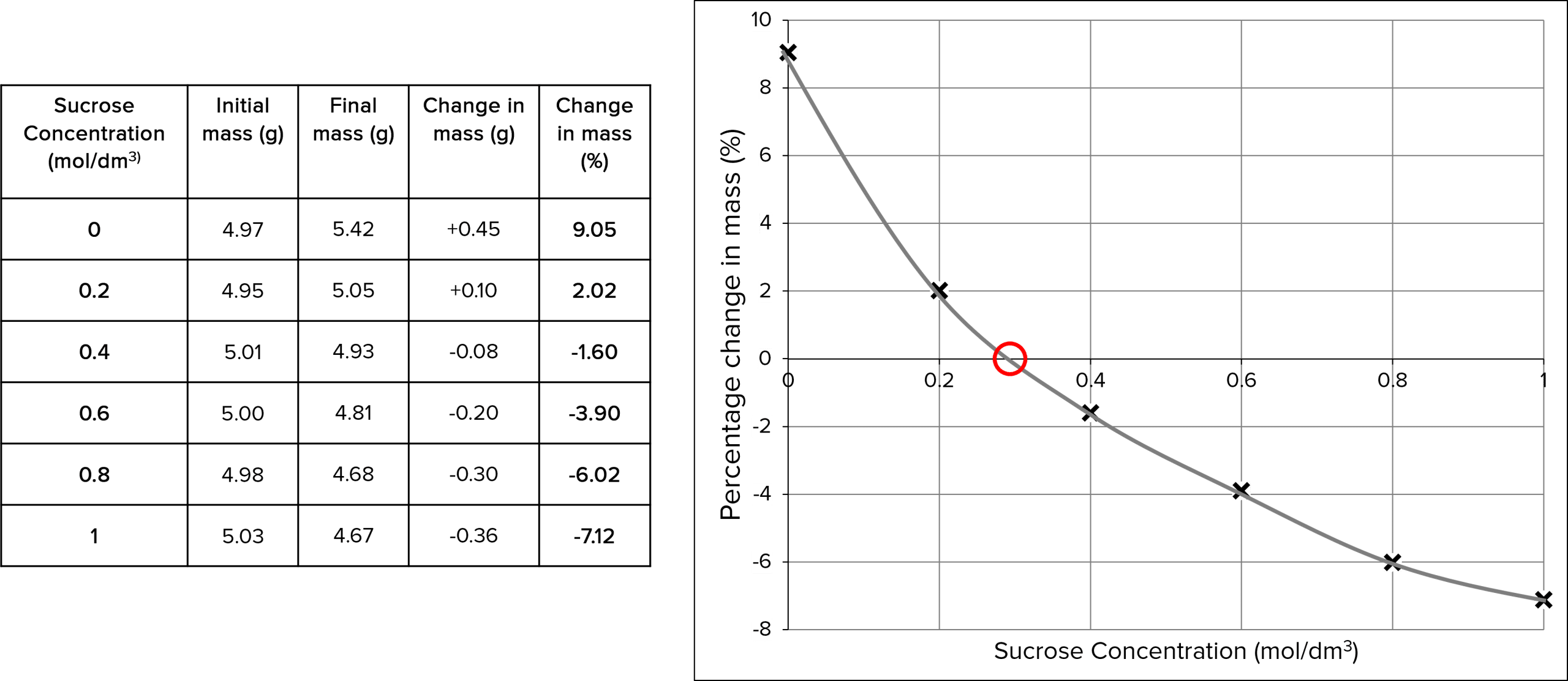 To display the results and work out the concentration of sucrose inside the potato you can plot the percentage change in potato mass (y-axis) against the concentration of sucrose solution (x-axis). The concentration of sucrose inside the cell is where the line of best fit crosses the x-axis.