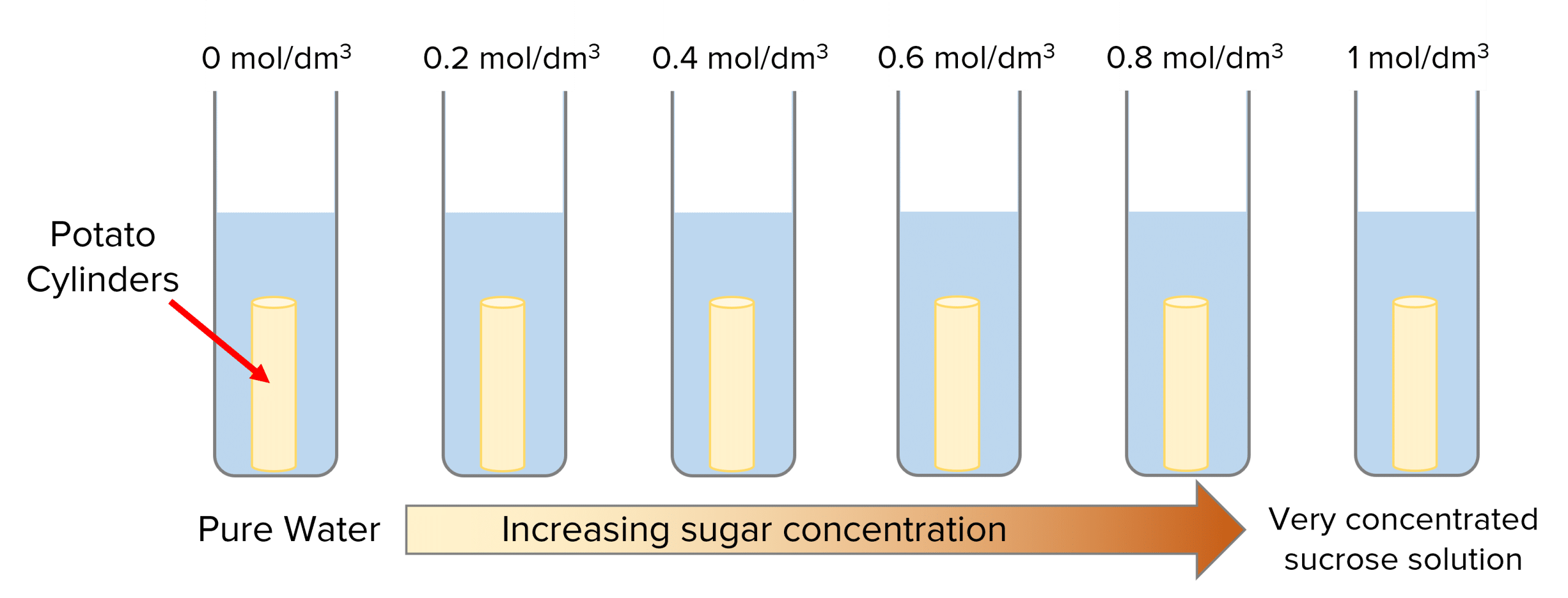 - Set up test tubes containing 10\text{ cm}^3 of different sucrose solutions. They should all have different concentrations, ranging from pure water (control) to very concentrated solution \text{(}1\text{ mol/dm}^3\text{)}.