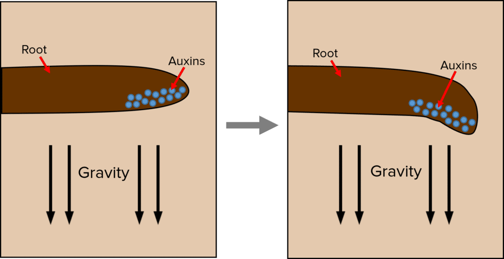 - Gravity causes auxins to accumulate on the lower side of a root.