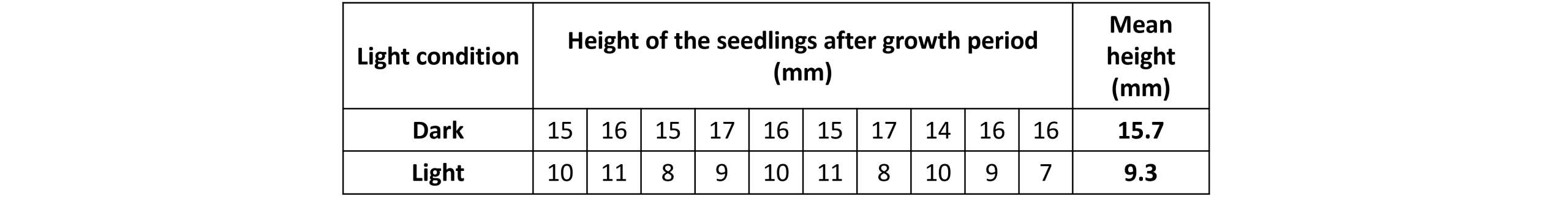 You can then calculate and compare the mean height of the seedlings grown under the overhead light and in the dark.