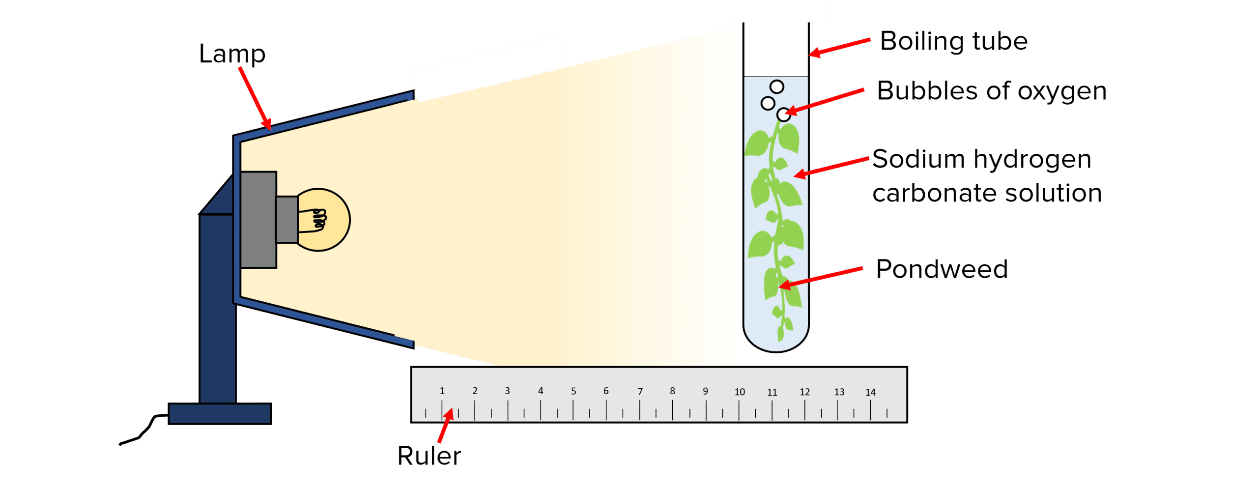 - Place a piece of freshly cut pondweed in a boiling tube filled with sodium hydrogen carbonate solution.