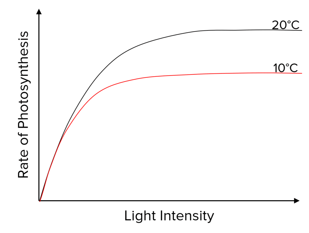 However, low temperature can also limit the rate of photosynthesis. The 10\text{°C} line levels off at a much lower rate that the 20\text{°C} line.