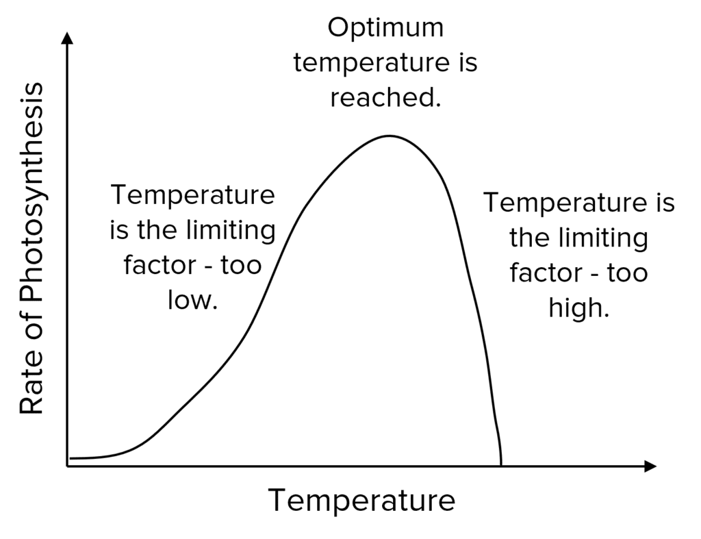 Increasing the temperature will increase the rate of photosynthesis up to a certain temperature because the enzymes will have more kinetic energy and are therefore more likely to successfully collide with the substrate. This means that temperature is the limiting factor.