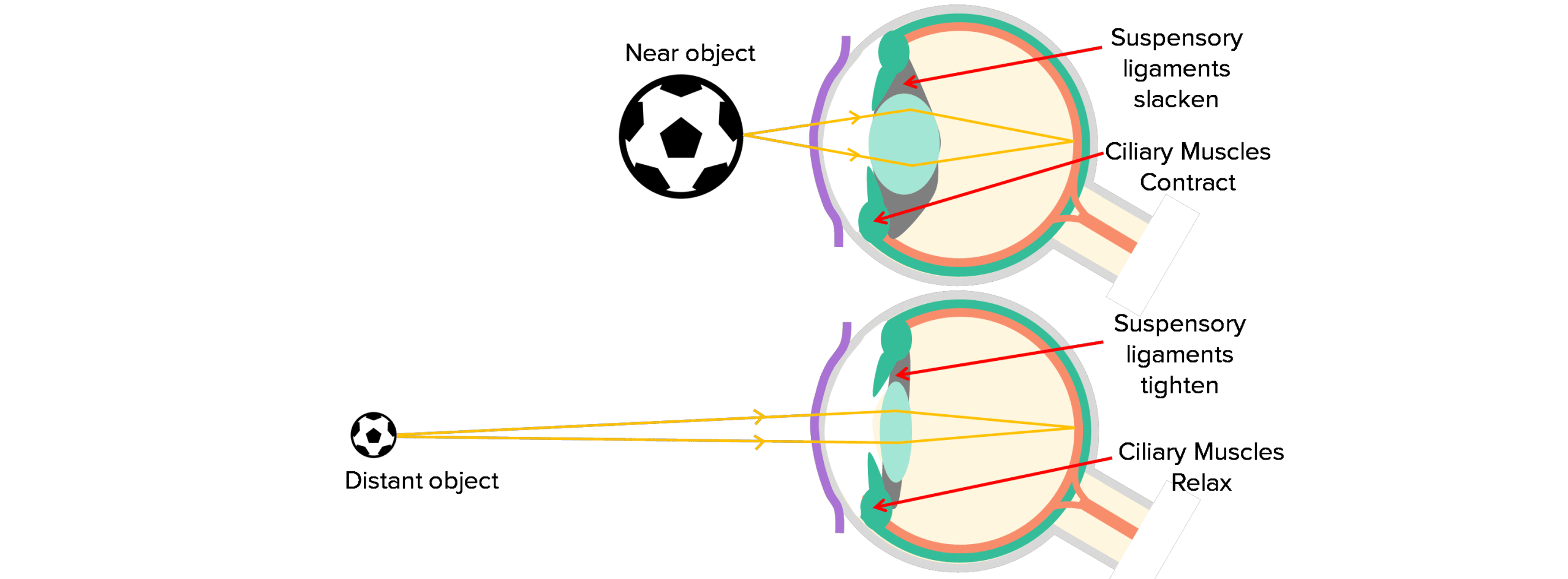 When looking at an object that is far away, the ciliary muscles relax and suspensory ligaments tighten. This makes the lens thinner and the light rays are refracted only a little.