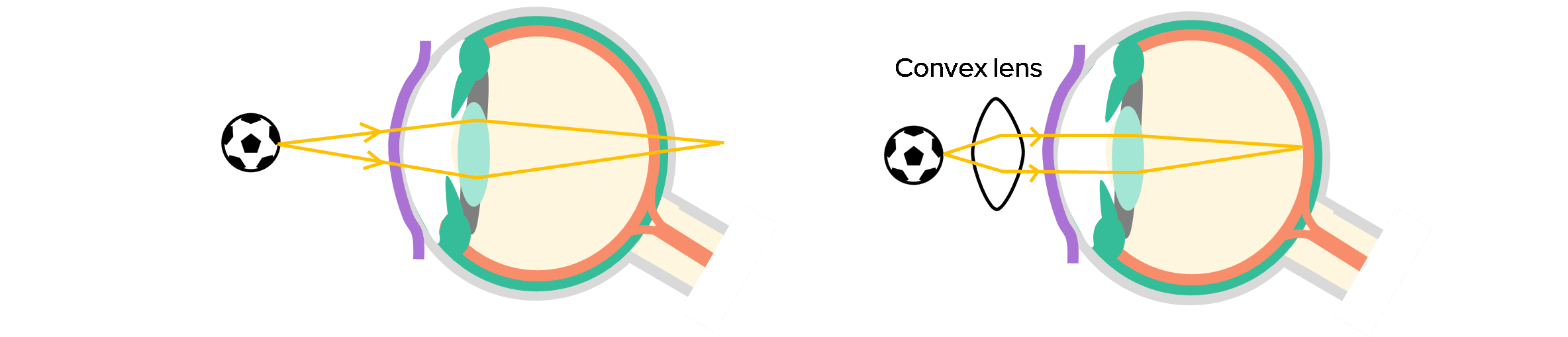 Glasses with convex lenses help by refracting the light onto the retina.