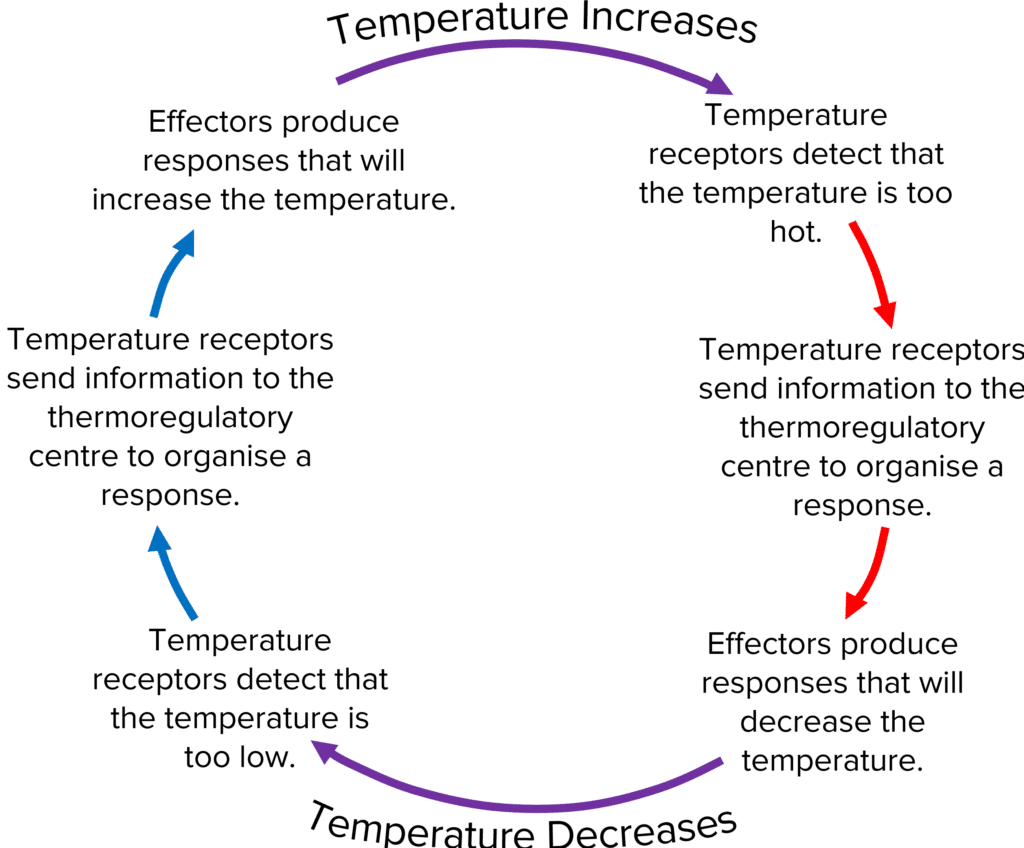 - Effectors will produce responses that will increase or decrease body temperature accordingly, returning it back to normal.
