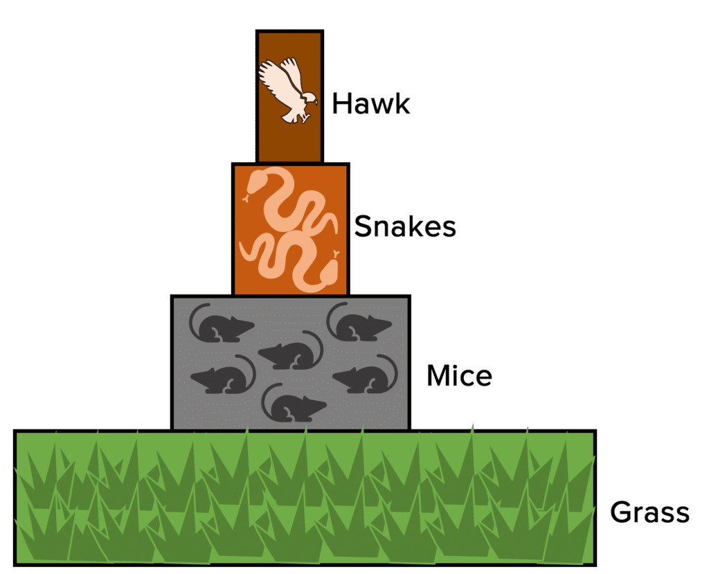 The food chain from the previous section is depicted in the pyramid of biomass to the right. The total mass of grass is greater than the total mass of mice that feed on it. The total mass of mice is greater than the total mass of snakes and the total mass of the snakes is larger than the total mass of the hawk.