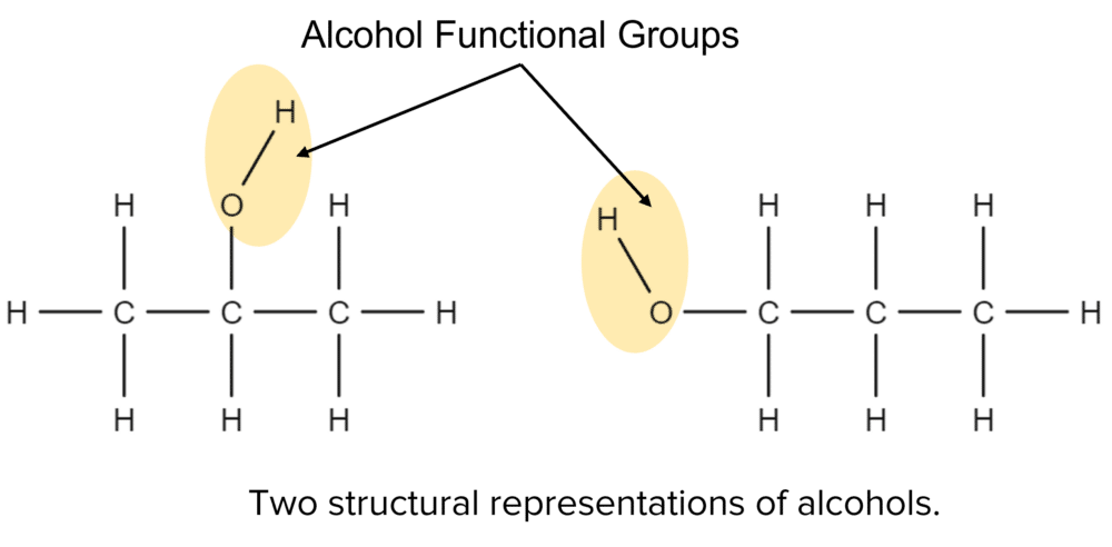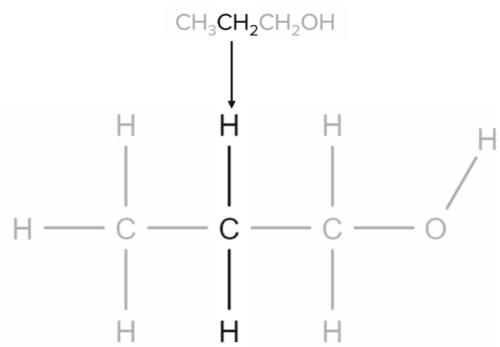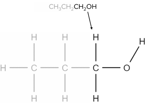 In this case, the alcohol group is located at the end of the chain, giving the \text{CH}_2\text{OH} group in the molecular formula. It is possible for the alcohol to exist in the middle of the chain however and this would give a formula of \text{CH}_3\text{CHOH}\text{CH}_3.