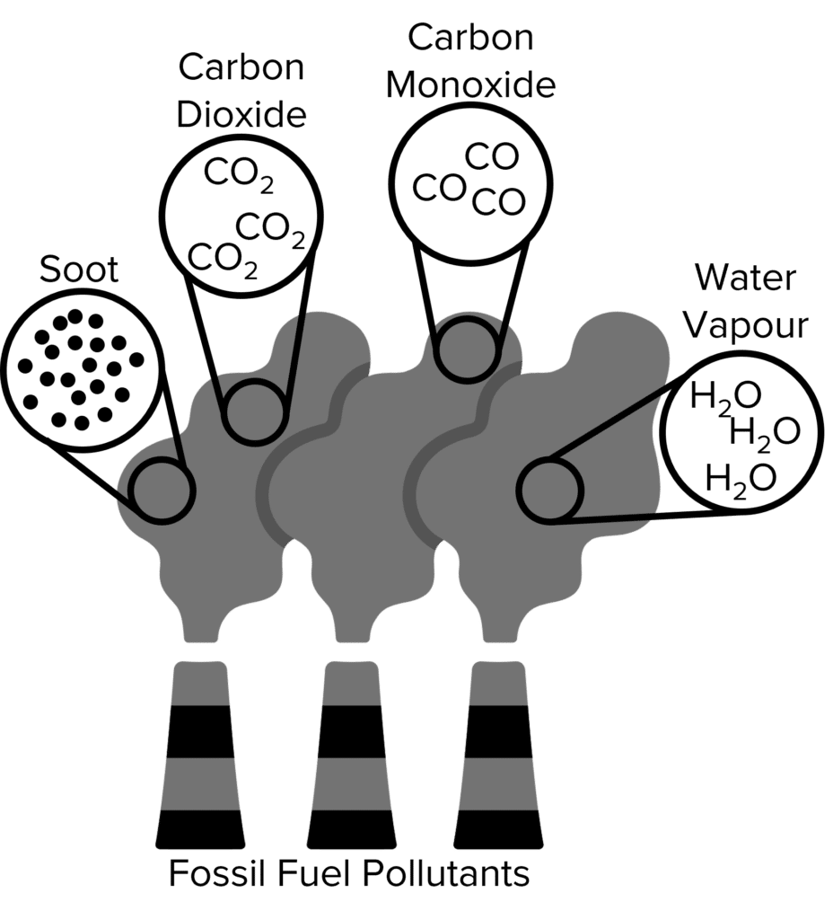 Fossil fuels may also undergo incomplete combustion. This happens when fuels burn without enough oxygen to oxidise all of their hydrocarbon molecules. When this happens, carbon monoxide \left(\text{CO}\right) is produced and released into the atmosphere. Carbon monoxide is a toxic gas. When inhaled, carbon monoxide will bind to red blood cells instead of oxygen. When inhaled in large quantities, carbon monoxide can prevent oxygen circulation, leading to fainting, coma, and, in the most extreme cases, death.