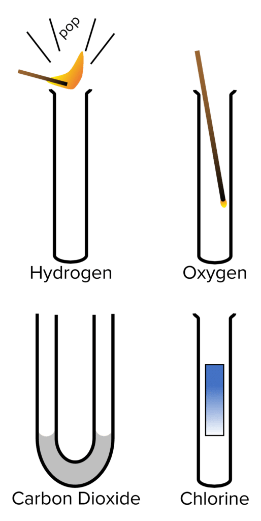 There are multiple gasses that can be produced in chemical reactions that are important to identify. These gasses can be identified using simple test tube chemical reactions. The four most commonly tested for gasses are hydrogen, oxygen, carbon dioxide, and chlorine.