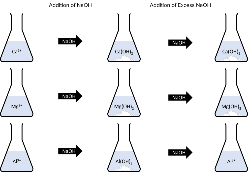 Metal ions can also be identified using sodium hydroxide. Metal ions in solution will often react with sodium hydroxide \left(\text{NaOH}\right) to form metal hydroxide precipitates. The chemical behaviours of these precipitates and their colours will identify the presence of a given ion in solution. Calcium, Aluminium, and Magnesium all form white precipitates upon reaction with \text{NaOH}. Aluminium hydroxide can be identified by adding more \text{NaOH} as \text{Al}\left(\text{OH}\right)_3 is the only precipitate that will dissolve in excess sodium hydroxide: