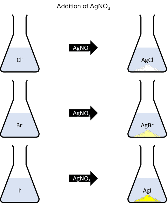 Halide ions form when the halogens gain an electron and become negatively charged. Halide ions can be identified by their reactions with aqueous silver nitrate. Chloride, bromide, and iodide ions will all react with silver nitrate to form precipitates. The colours of these precipitates will identify the halide ion that formed them; sliver chloride is a white precipitate, silver bromide is cream, and silver iodide is yellow: