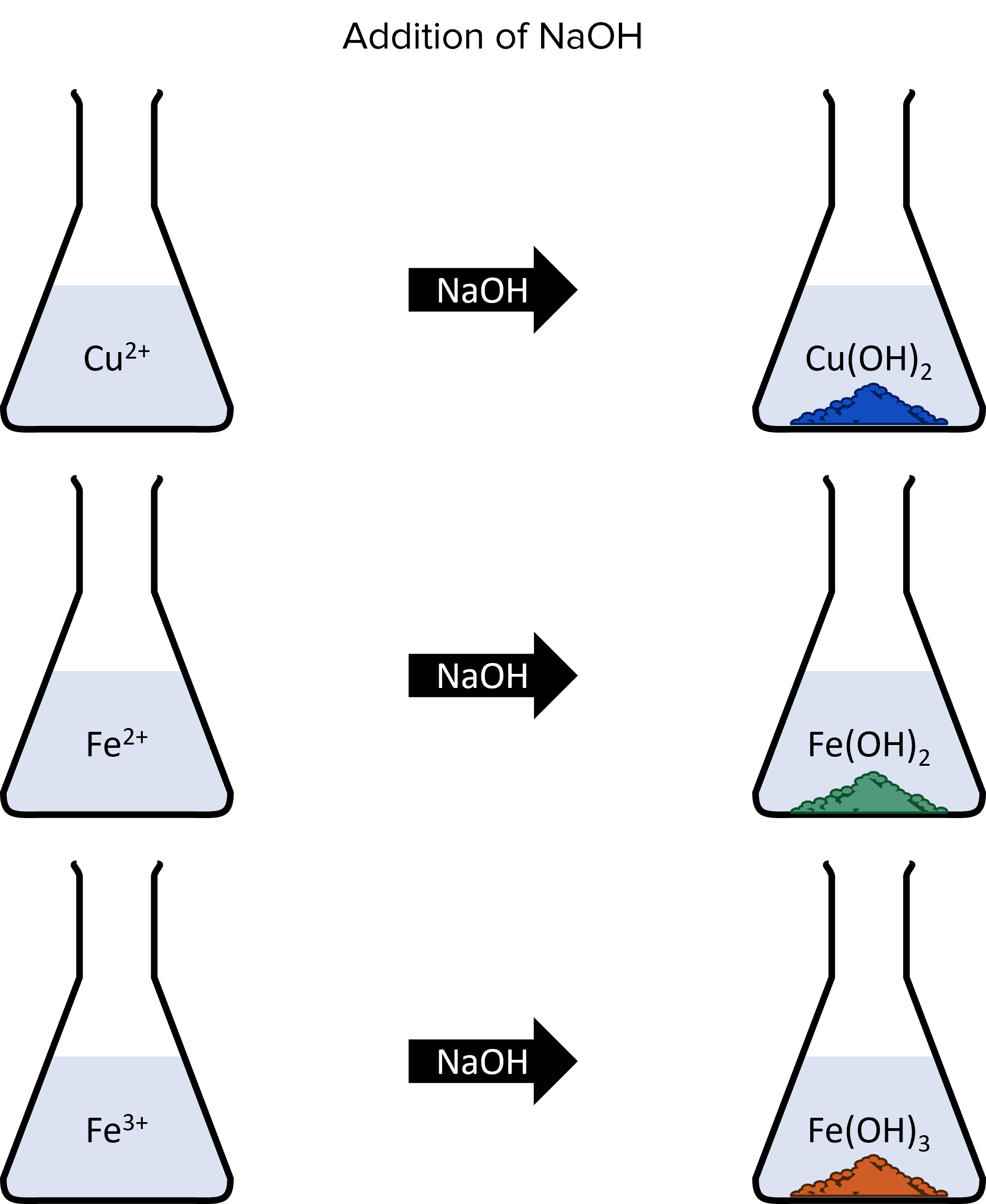 When copper and iron ions react with sodium hydroxide, they will produce coloured precipitates. Copper will form a blue precipitate of copper hydroxide and iron forms two precipitates, depending of the charge of the ion. Iron (II) \left(\text{Fe}^{2+}\right) forms a green precipitate and iron (III) \left(\text{Fe}^{3+}\right) forms a brown precipitate: