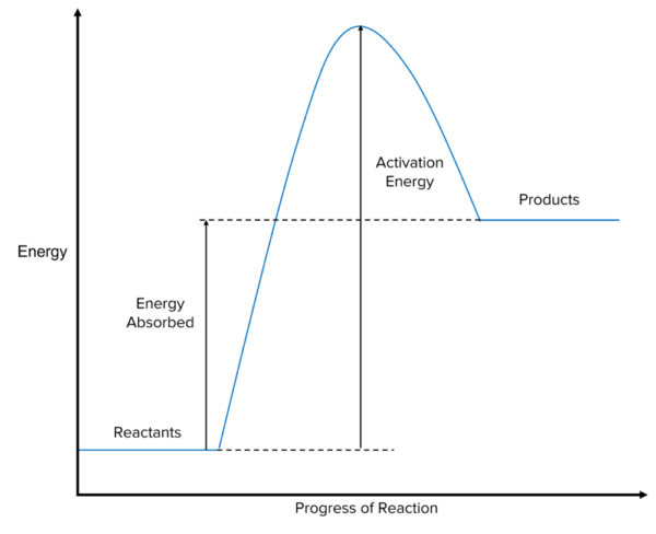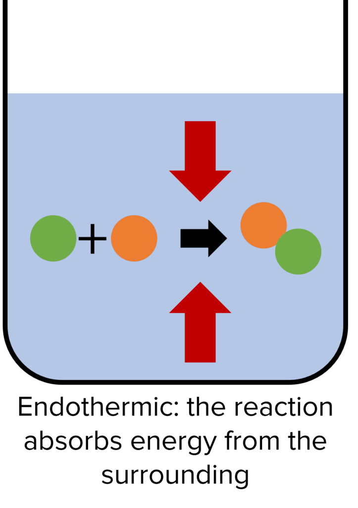 Endothermic reactions are chemical reactions that absorb energy from their surroundings. In these reactions, the energy stored by the reactants is less than the energy stored by the products. This means that the energy has to be absorbed for the reaction to happen. Because energy cannot be created it must be transferred into the chemical reaction by the surroundings. The energy absorbed by the chemical reaction will be equal to the difference between the energy of the products and the energy of the reactants.