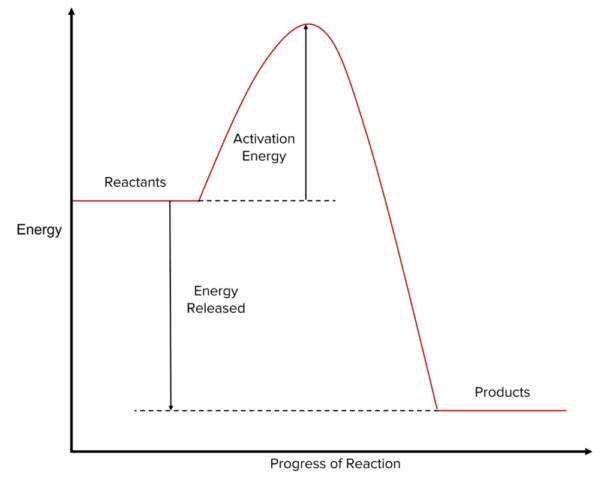 Reactions that are exothermic are characterised by systems where there is more energy stored in the reactants than in the products. This means that, in the energy profile, the level at which we draw the energy of the reactants is higher along the y-axis than that of the products. The difference in height between them will be equal to the energy released by the reaction to its surroundings.