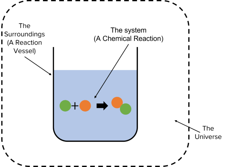 In practice this means that if a chemical reaction causes the system to lose energy then this energy must have been transferred to the surroundings. When talk about energy changes, the system and the surroundings have a defined meaning. In this case, the system is the chemical reaction being studied. The surroundings can be taken as the reaction vessel in which the chemical reaction takes place. The universe is a combination of the system and the surroundings.
