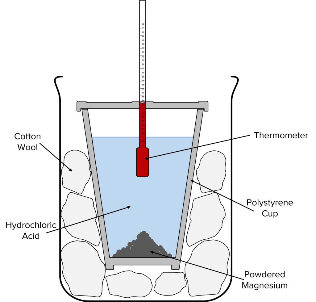 By mixing reactants in an insulated cup it is possible to determine the effects of changing conditions on the temperature change of a reaction. In this experiment, the effects of concentration of acid on temperature changes are measured.