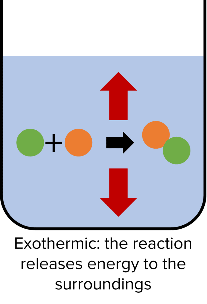 When exothermic reactions take place, the temperature of the surroundings increases as a result of the release of energy. Examples of exothermic reactions are combustion, neutralisation of an acids and bases, and the freezing of water.