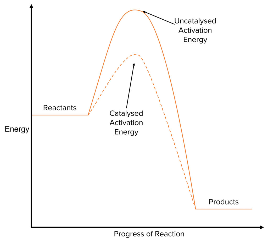 Catalysts are added to speed up chemical reactions. They do this by providing an alternative reaction pathway with a lower activation energy than the uncatalysed reaction. This will lead to more particles in the system having at least the minimum energy needed to react. This increases the proportion of collisions in the reaction that are successful, leading to a higher rate of reaction.