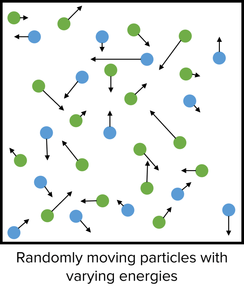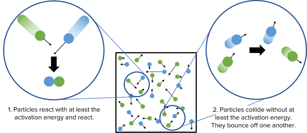 When particles undergo chemical reactions, they move around randomly in the reaction mixture with lots of different energies. These randomly moving particles will often collide with each other and, if the right conditions are met, they will react with one another. This model of chemical reactions is known as collision theory.