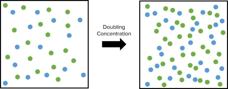 Increasing the concentration of reactants will also increase the total number of collisions. In this case, imagine a container containing reacting gasses. Instead of reducing the size of the container, we double the concentrations of the reacting gasses. This will double the number of particles present in the container.