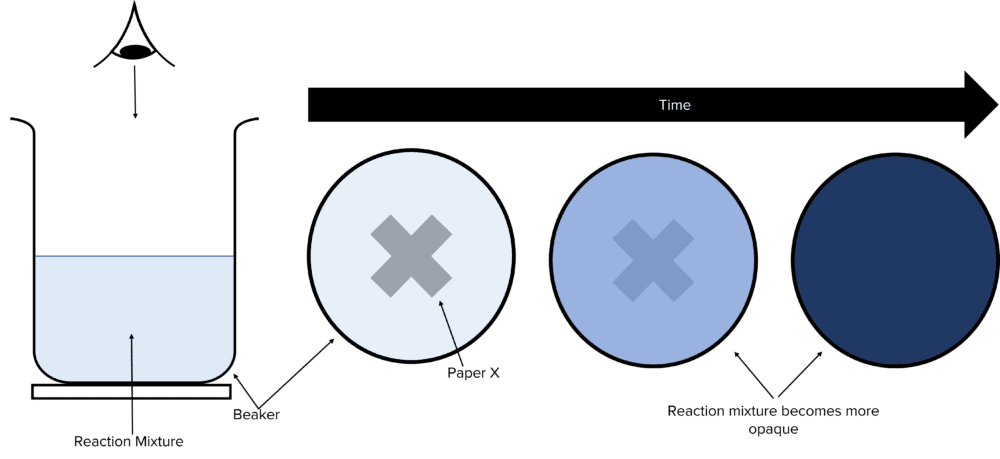 Another experiment involves timing how long it takes for a reaction mixture to become opaque. In this method, a black coloured X is placed below a beaker containing chemicals that, upon reaction, produce an opaque solution. This obscures the X, allowing the progress of the reaction to be monitored.