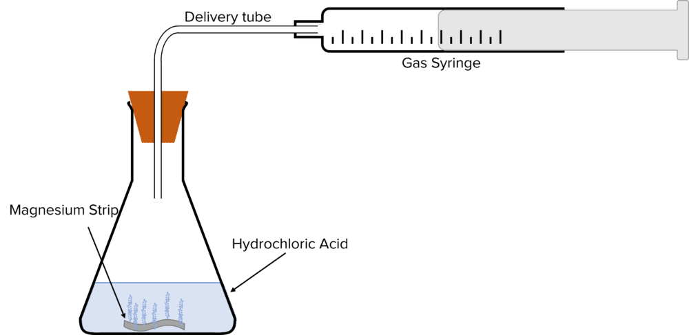 - Immediately upon addition of the hydrochloric acid, seal the flask with a bung with a delivery tube inserted through the centre. Connect the delivery tube to a gas syringe.