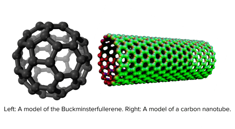 Fullerenes are special types of carbon molecules shaped like either tubes or hollow balls. The first fullerene to be discovered was the Buckminsterfullerene \left(\text{C}_{60}\right), a hollow ball made up of 60 carbon atoms. Carbon nanotubes are long hollow cylinders made up of carbon atoms. The properties of nanotubes make them useful for a wide range of electronic applications. Similar to graphene, carbon nanotubes can be used to strengthen materials without adding much to their weight. Because fullerenes are hollow, they are often used to deliver drugs inside the body or as catalysts for chemical reactions.