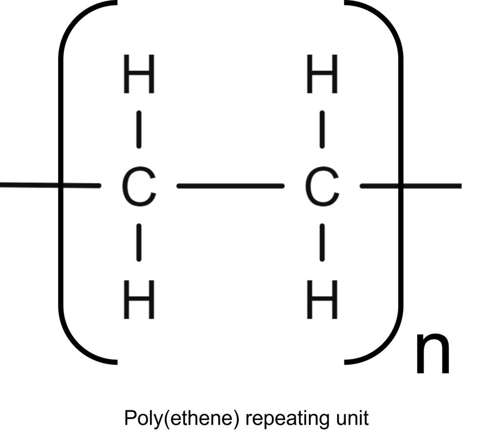 Due to the incredible number of atoms involved, it would be impractical (if not impossible) to draw out the whole structure of a polymer. Instead, the structure of the repeating unit is identified and used as a stand in. To differentiate the repeating unit molecules off the polymer chain from an individual molecule, we wrap the structure in brackets. Next to this, we write the number, n, of repeating units in the chain. When drawing this repeating unit, the bonds at the sides of the molecule are extended outside the brackets to show that connection to the adjacent repeat units.