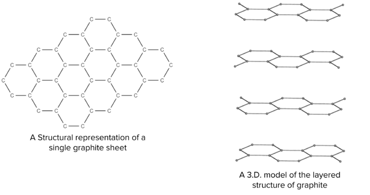 Graphite is a special type of giant covalent structure. In graphite, each carbon atom is bonded to 3 other atoms. Because carbon is able to make 4 bonds, this arrangement leaves each carbon atom with a free electron (delocalised). As a result, graphite is able to conduct electricity thanks to the presence of these delocalised electrons. The carbon atoms in graphite are arranged in flat sheets of connected hexagons.