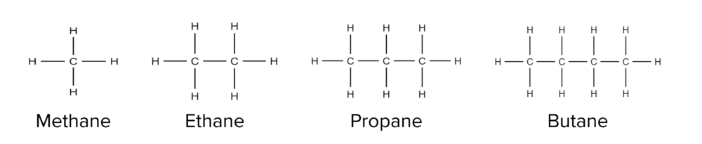 The only exceptions to these rules are the first four alkanes (shown above). These molecules do not have numerical prefixes and instead have unique ones, these are:
