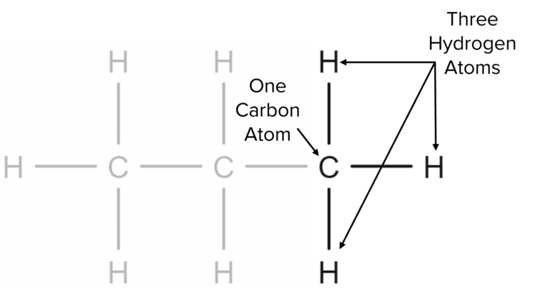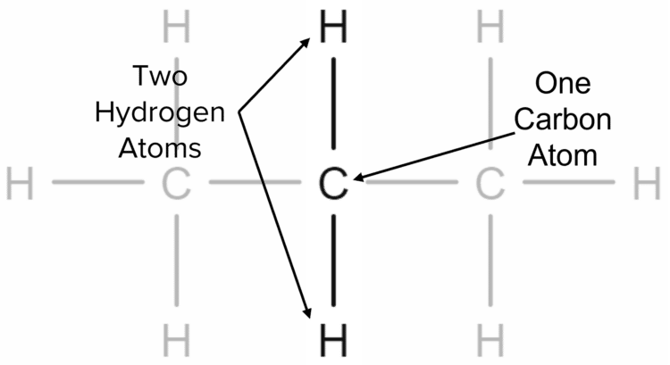 Here we have an additional hydrogen atom bonded to the carbon at the end of the chain. As the chain has two ends, there must be two additional hydrogens in the structure, one at each end. We can again generalise this to say that, for each end carbon in an alkane chain, there is one additional hydrogen atom.
