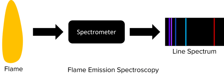 Flame emission spectroscopy is a common technique to analyse the elements and ions contained within a sample. In flame emission spectroscopy, a sample is placed in a flame, causing it to burn. The light from this flame is then passed through a spectrometer which is able to detect the different wavelengths of radiation that are present. This information is used to produce something called a line spectrum.