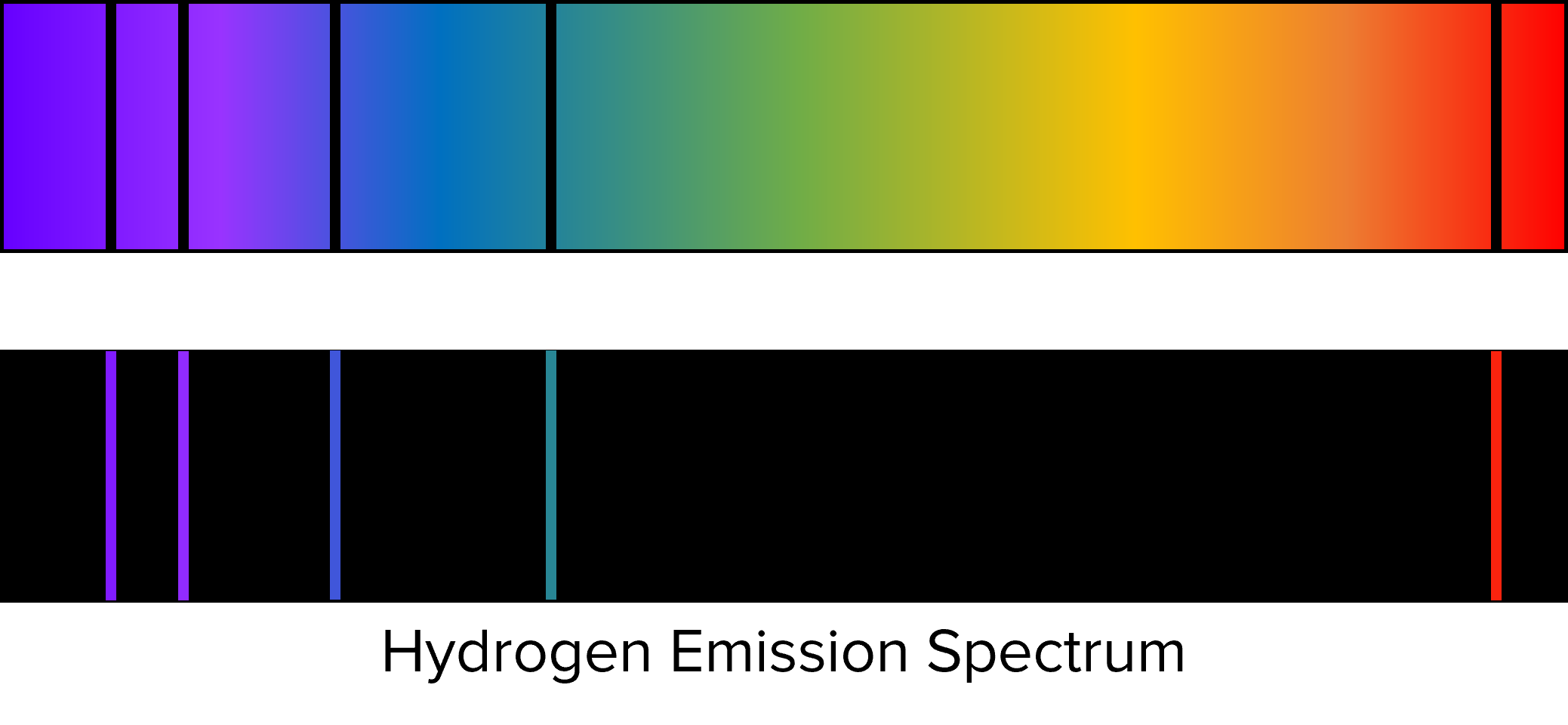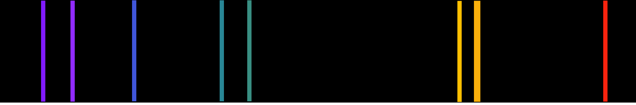 This radiation often falls within the visible spectrum an will correspond to specific colours. By analysing these emissions we can produce a line spectrum. These line spectra contain only the light emitted by the sample, and consist of narrow lines found at fixed wavelengths. To illustrate this, the line spectrum for hydrogen is shown below.