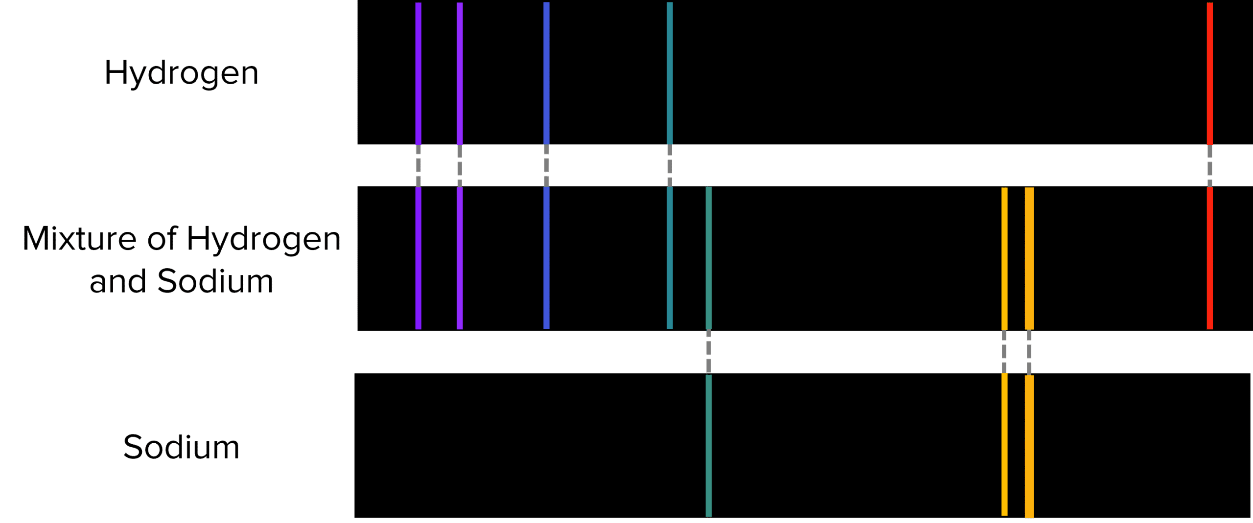 These unique spectra can be used to determine the identity of single ions and of ions in a mixture. For example, a mixture of hydrogen and sodium atoms would produce the following line spectra.