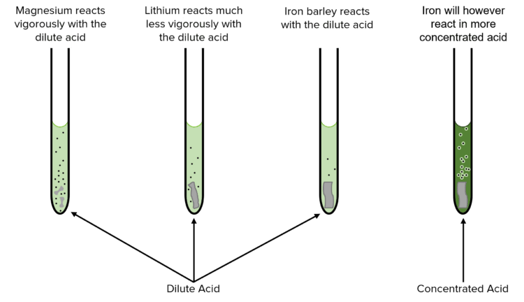 The reactivity of a metal will determine how quickly a metal will react in water or acid, and under what conditions. More reactive metals, such as sodium or magnesium, will react readily (even violently) with dilute acids; less reactive metals will react only very slowly.