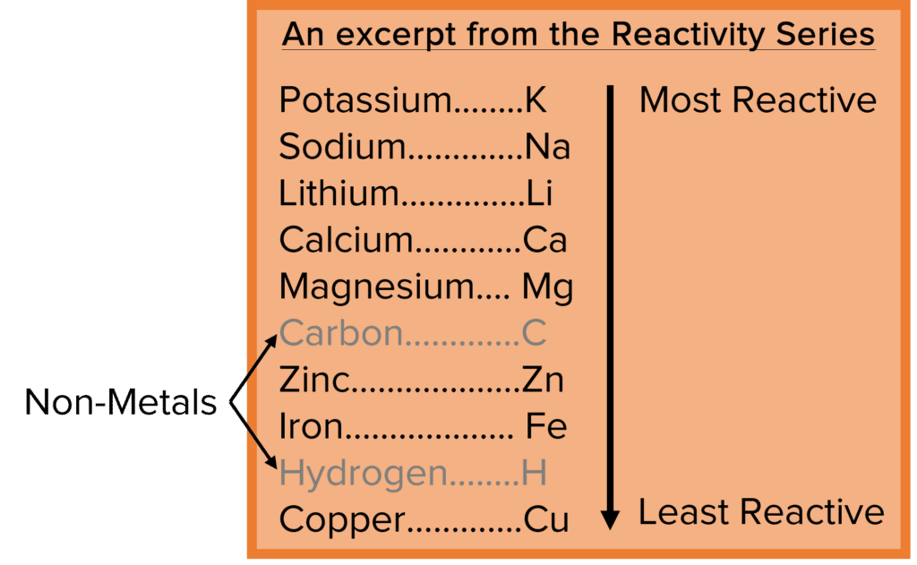 Though composed primarily of metals, the reactivity series does contain some non-metal elements, for example carbon and hydrogen. The presence of these non-metal elements can tell us about the different methods that can be used to obtain pure metals from their ores.