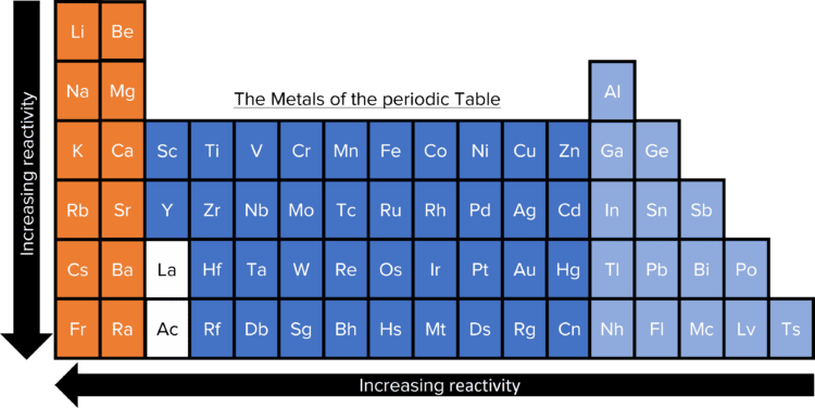 Metals are the most common elements on Earth. Fully 78\% of the elements on the periodic table are metals. With this volume, comes wide range of properties and chemical behaviours. That does not mean however that there are no similarities. All metals, for instance, can form oxides, can conduct electricity, and, with the exception of mercury, are solids at room temperature. The reactivity of metals is governed by their desire to form positive ions. This leads metals to react readily with oxygen and even more so with water. The reactivity of metals can be compared using the reactivity series.