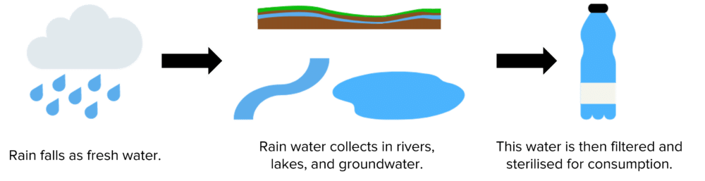 In the UK, the majority of our freshwater comes from the filtration and sterilization of freshwater sources. The rainy climate of the UK provides a source of water with a low concentration of dissolved salts. This rain water falls to the earth, where it collects to form surface water (e.g. rivers and lakes) and ground water (water that is stored underground).