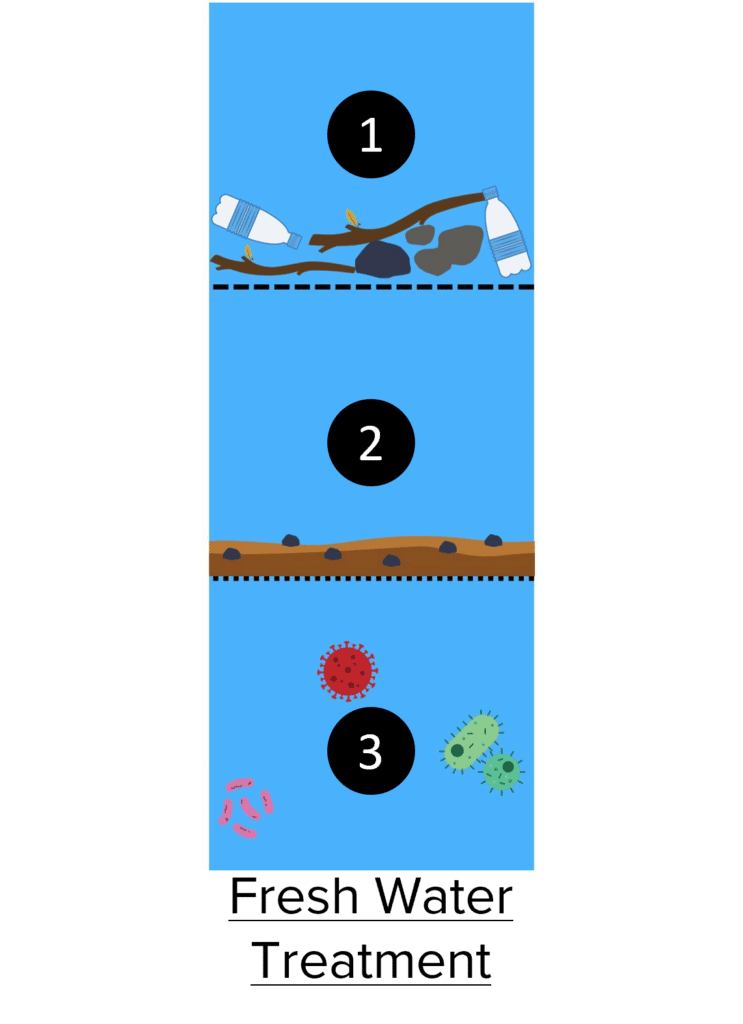 Though fresh water does not contain high concentrations of salts, it must still be treated before it becomes potable. This treatment is typically done in three stages, two filtration steps and then a sterilisation step.