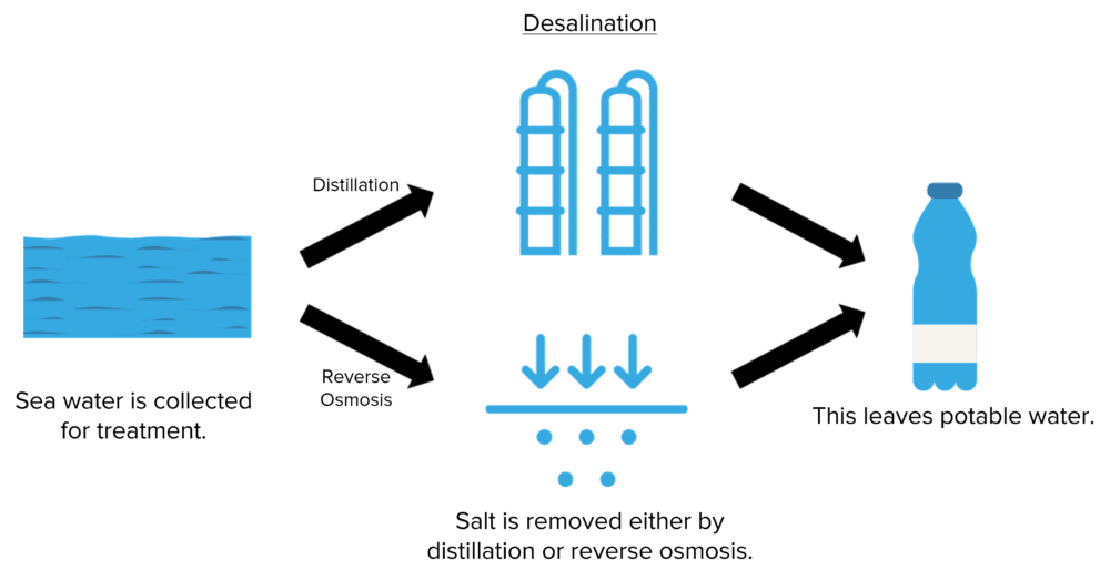 The UK has a fairly rainy climate and this give us access to a lot of fresh water. In some countries however, there is significantly less rain and so less access to fresh water. In these circumstances, countries must turn to the sea water to meet their needs.