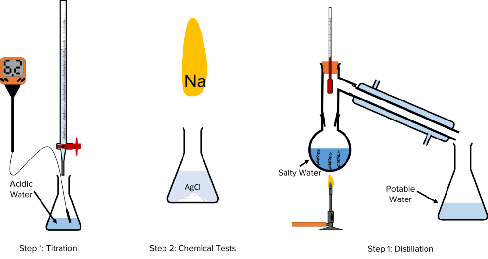 By carrying out a series of experiments, it is possible to produce a sample of clean potable water in the laboratory. To do this, we must first ensure that the water has a neutral \text{pH}. We then need to determine what containments are in the water. Finally, we must distil the water to remove these contaminants. We can therefore break the process down into three steps; titration, chemical tests, and distillation.
