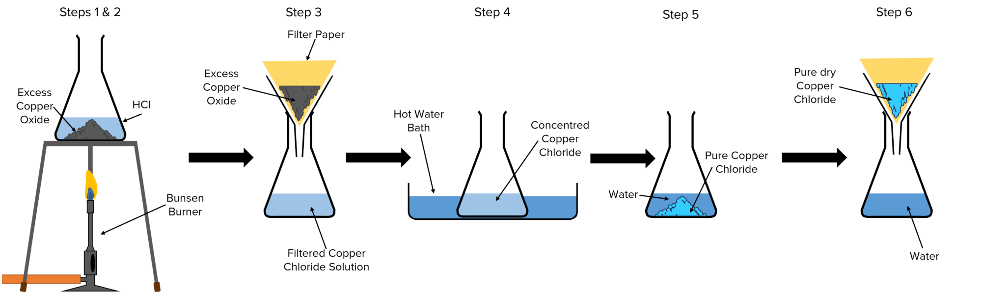- Filter the resulting copper chloride solution to remove the excess \text{CuO}.