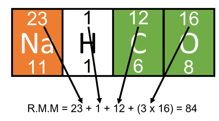 - As such, we need to find the atomic mass of a sodium atom, a hydrogen atom, a carbon atom, and an oxygen atom. As there are three oxygen atoms in the formula, we will also need to multiply its atomic mass by 3 when calculating our RMM: