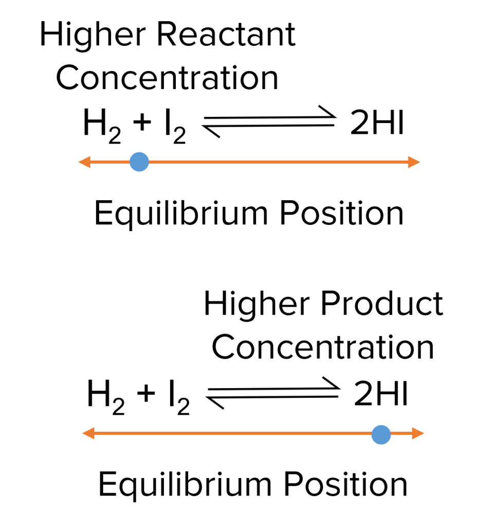 Though the concentrations of the reactants remain constant, they are not necessarily equal. In any given equilibrium, there may be a higher concentration of reactants or a higher of concentration of products. The difference in reactant and product concentrations is referred to as the position of the equilibrium.