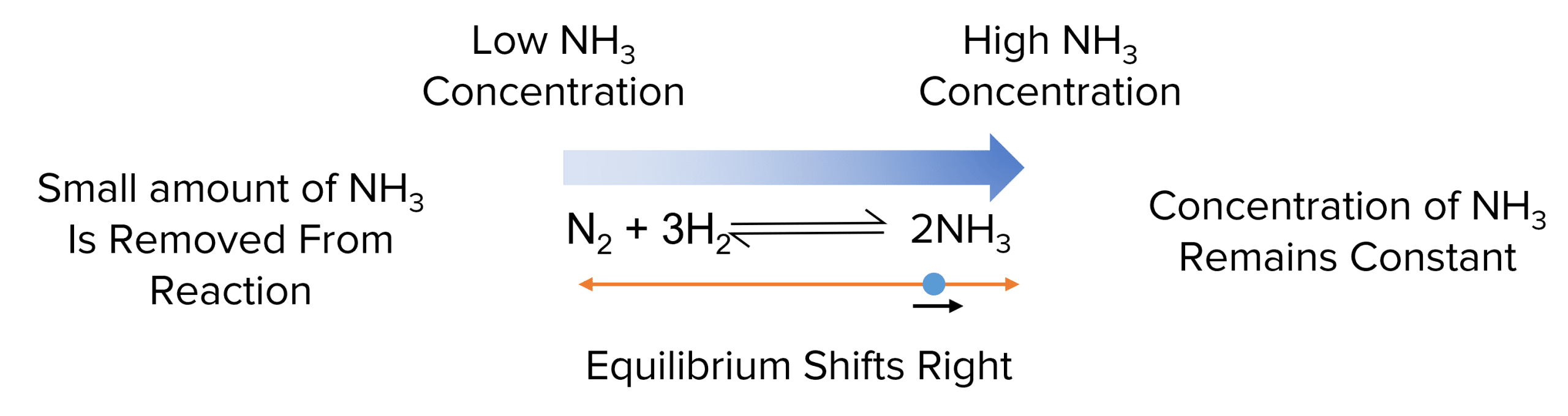 Similarly, if a small volume of ammonia is removed from the system, the equilibrium will shift to the right to make up for the loss.
