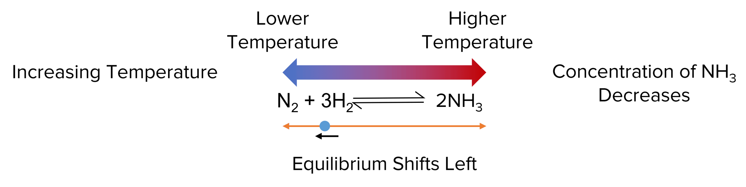 Conversely, if the temperature of the reaction is decreased the equilibrium will move to counteract this change by increasing the temperature. This leads the equilibrium to shift towards the exothermic side of the equilibrium. In this case, the equilibrium shifts right, increasing the concentration of \text{NH}_3.